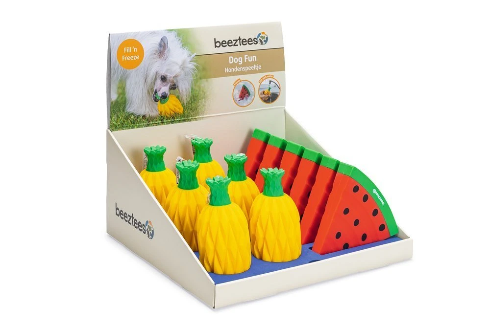 Beeztees Hondenspeelgoed Fill-N-Freeze Fruit is geschikt om jouw hond verkoeling te geven tijdens warme dagen. Want net als wij mensen vinden honden verkoeling ook heerlijk. Het fruit is gemaakt van silicone en kan aan de onderzijde via de opening gevuld worden met water. Nadat het fruit is gevuld, leg je het in de vriezer zodat het water kan bevriezen. Is het fruit lekker bevroren? Dan kun je het hondenspeeltje aan jouw hond geven. Spelen met het fruit zal zorgen voor heerlijke verkoeling in de bek.
