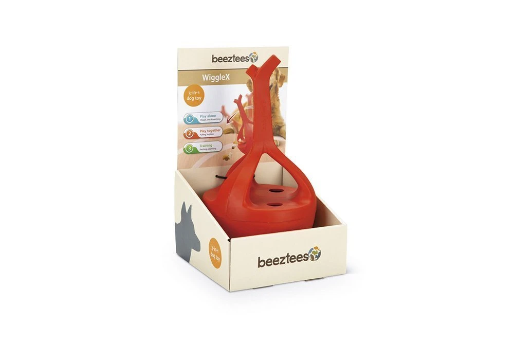 Multifunctioneel hondenspeelgoed met meerdere functies! Dat is de Beeztees WiggleX. Zoals de naam al doet vermoeden, wiebelt de WiggleX. Dit speeltje heeft een zware en bolle onderkant, waardoor deze heen en weer wiebelt. Hierdoor zal jouw hond er actief mee bezig blijven. Bovendien bevat de WiggleX drie gaten, waar hondensnacks in kunnen. Door de wiebel functie van het speeltje, zullen de snacks er na verloop van tijd uit vallen. Dit zal jouw hond helpen om de tijd, die hij alleen moet zijn, met plezier door te komen. Tot slot kan er ook met de WiggleX worden getraind, door samen met jouw hond te apporteren. De flexibele handgreep van de WiggleX maakt het gemakkelijk om deze te werpen, waarna jouw hond de WiggleX op kan halen en weer terug kan brengen.